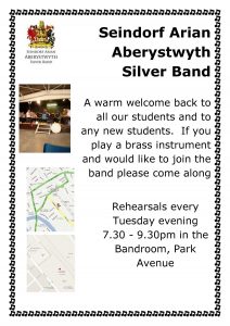 It’s that time of year again where Aberystwyth is buzzing with activity as students – new and old – return for the start of the academic year. As always students are very welcome to come along and join the band – just come along to the Tuesday night rehearsals – 7.30pm – 9.30pm in the Bandroom (Matalan carpark)